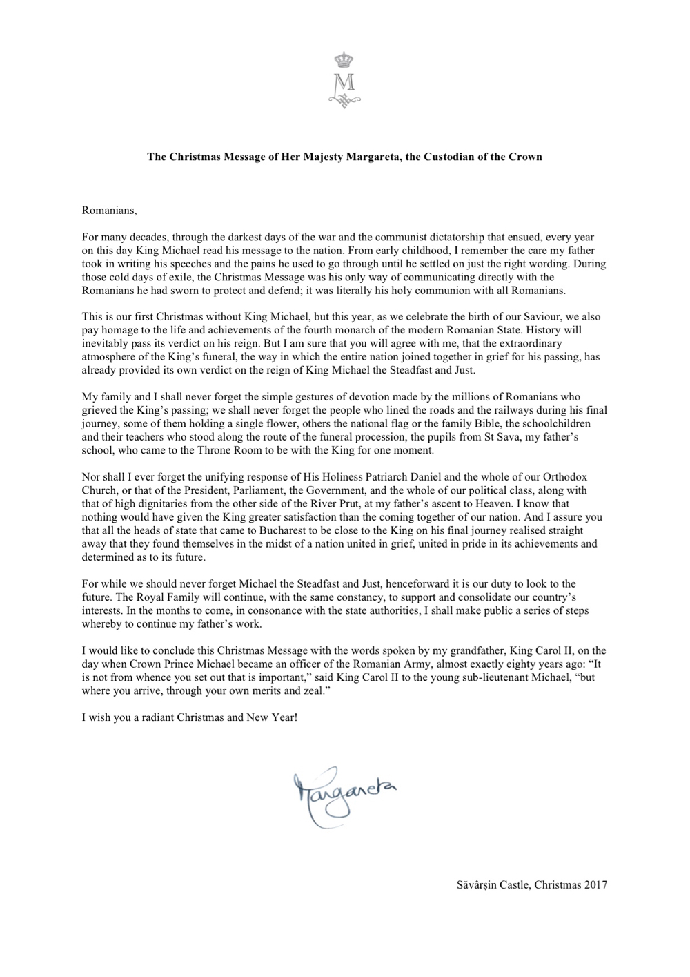 Christmas Message of Her Majesty Margareta, Custodian of the Romanian Crown