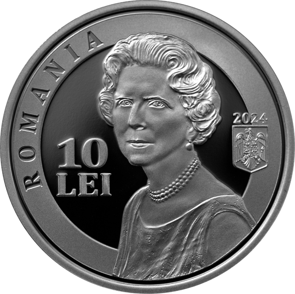 Obverse: the portrait of Queen Mother Helen of Romania, who advocated the construction of the first emergency hospital in Bucharest, the inscription “ROMANIA” in an arc, the face value “10 LEI”, the year of issue “2024” and the coat of arms of Romania.