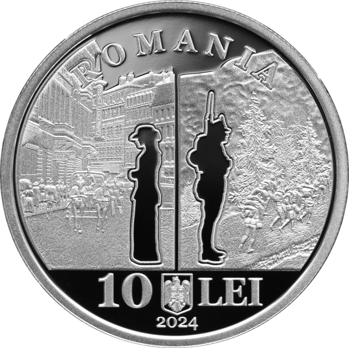 Obverse: a composition inspired by the novel entitled “Ultima noapte de dragoste, întâia noapte de război” (The Last Night of Love, the First Night of War) by Camil Petrescu, the inscription “ROMANIA” in an arc, the coat of arms of Romania, the face value “10 LEI”, and the year of issue “2024”.